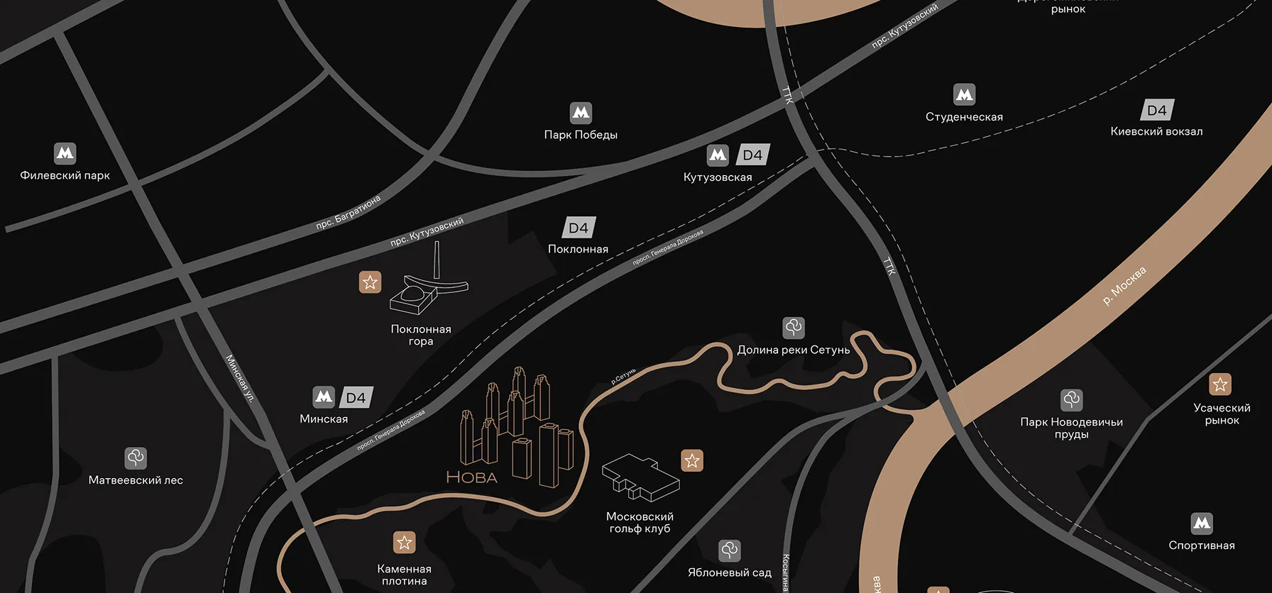 Проект расположен в объятиях парковых зон и ключевых локаций: «Долина реки Сетунь», парк Победы, Московский гольф-клуб, МГУ и Москва-Сити.